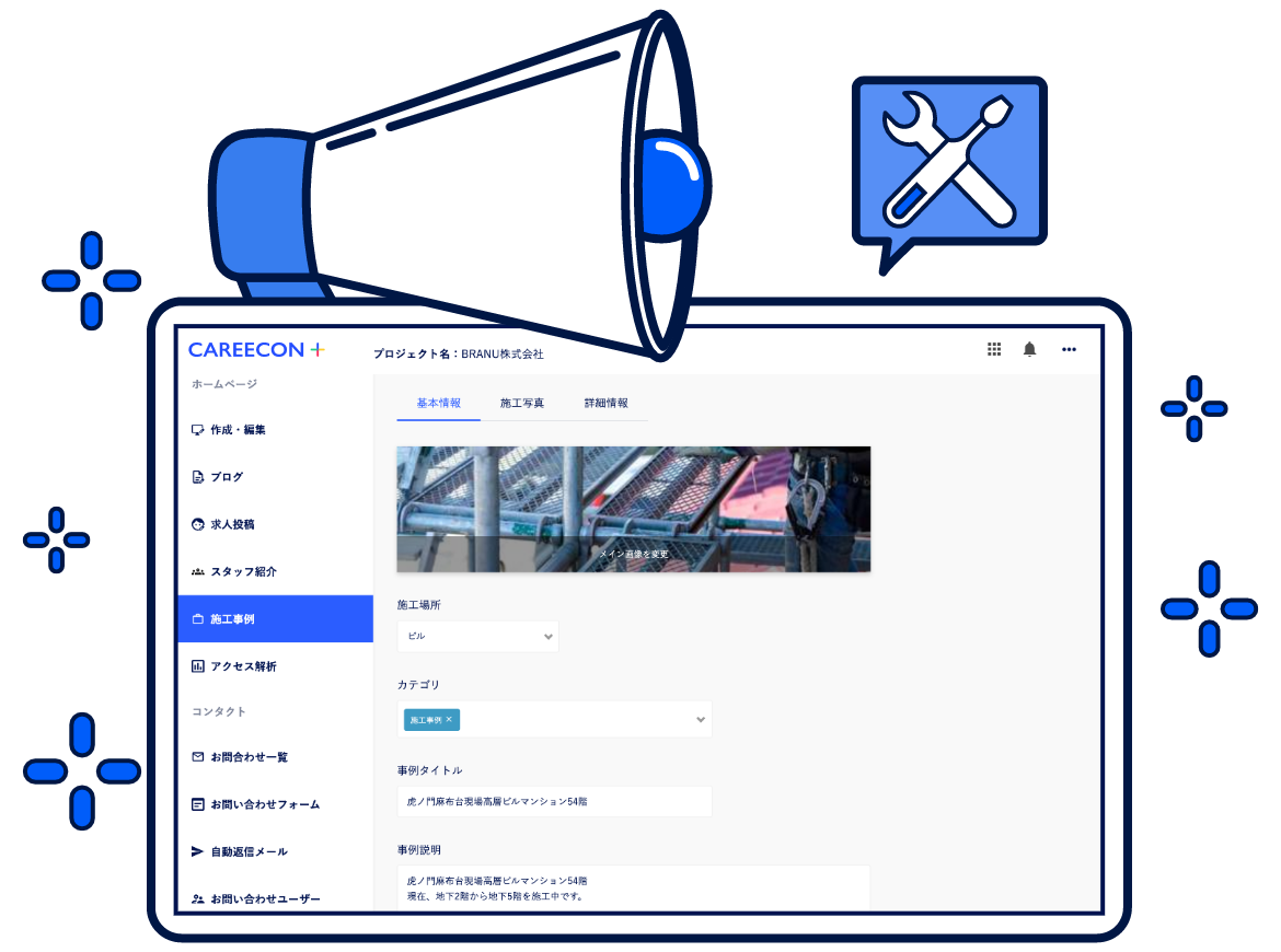 また、求職者にとってはどんな現場か、どんな技術が学べるのかを判断する材料にもなります。CAREECON Plusは工事の記録用写真をそのままWebサイトに掲載できるなど、普段の業務を変えずにPRにつなげられる機能を備えています。